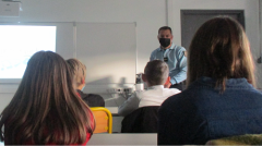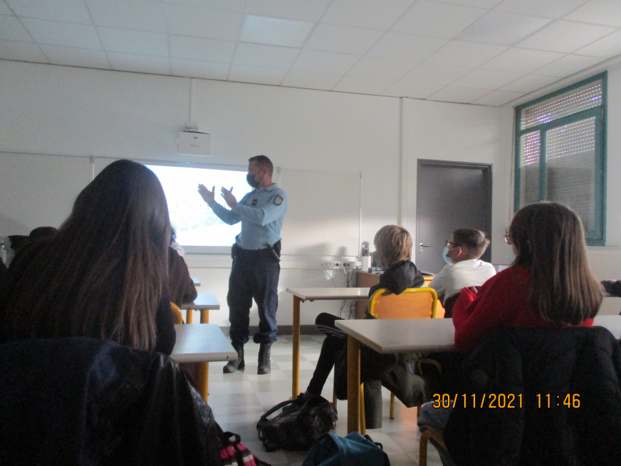 Le gendarme Anthony Le Garrec de la maison de protection des familles de Vannes est intervenu auprès des 5e du collège Yves Coppens le 30/11/2021.